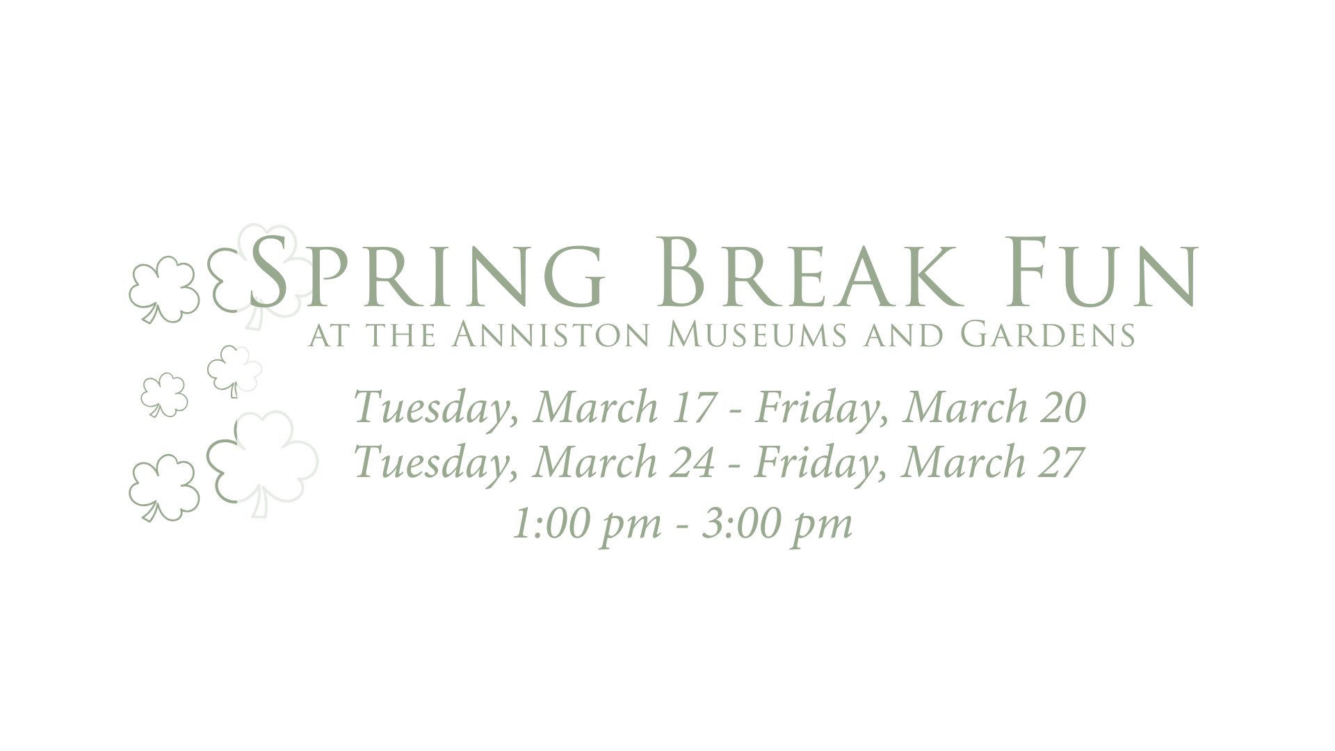 Anniston Museums and Gardens is closed Easter Sunday, July 4th, Thanksgiving Day, December 24-December 25 and December 31-January 1.