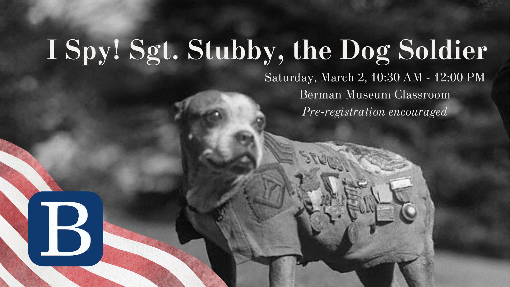 Each month we will explore a new topic or person in history through stories, scavenger hunts, and crafts. This month, learn about Sgt. Stubby, a homeless mutt who ended up being the most decorated animal in American military history. I Spy! is recommended for ages 6 – 10, but all are welcome. Pre-registration is encouraged.