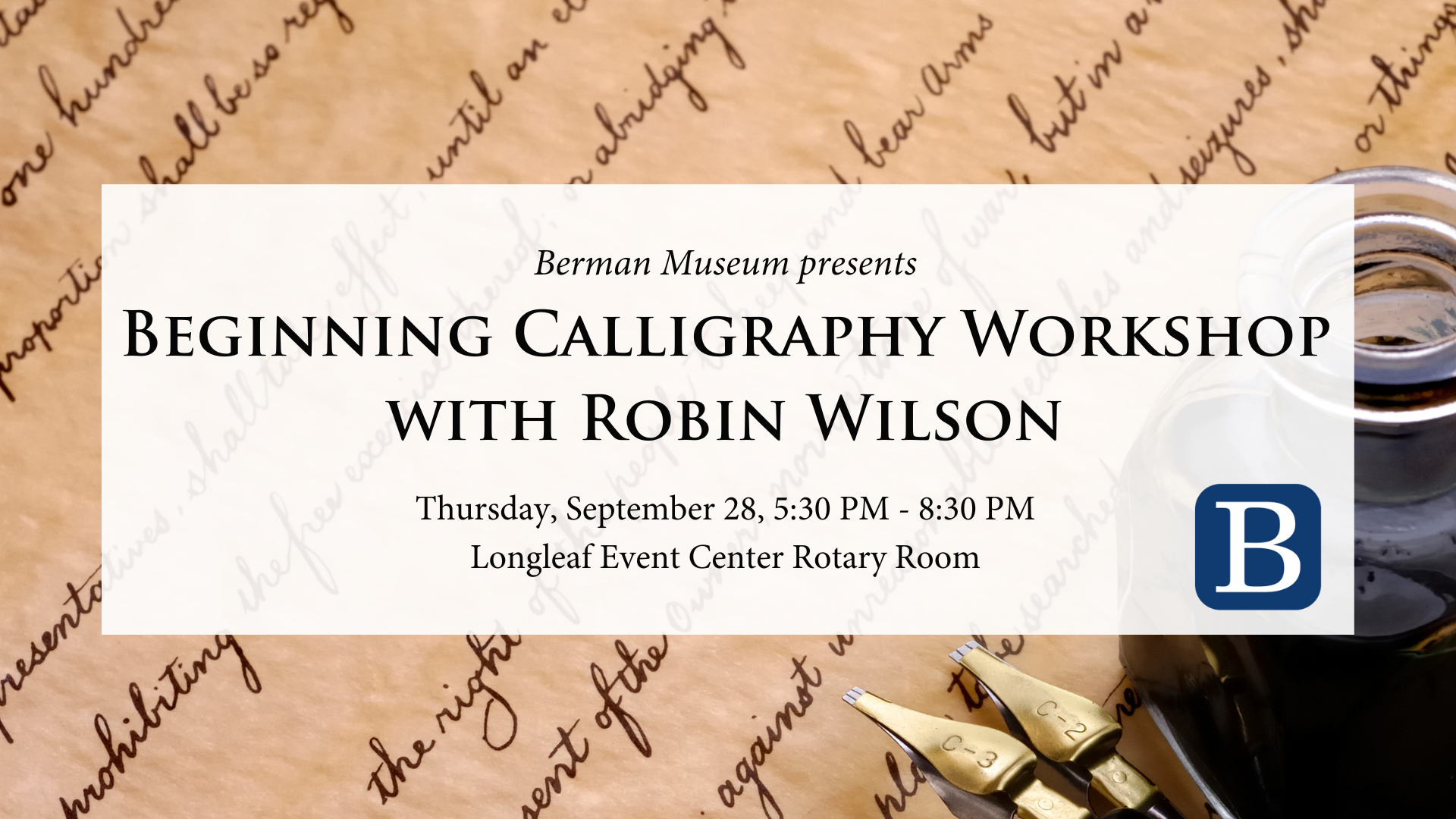 Join the Berman Museum and guest instructor Robin Wilson as we learn about the art form of calligraphy, basic guidelines, and tips. With these skills and practice, you, too, will be on your way to developing your own style to enjoy and share with others. Gain a new skill and view calligraphy-related artifacts from the Berman collection.