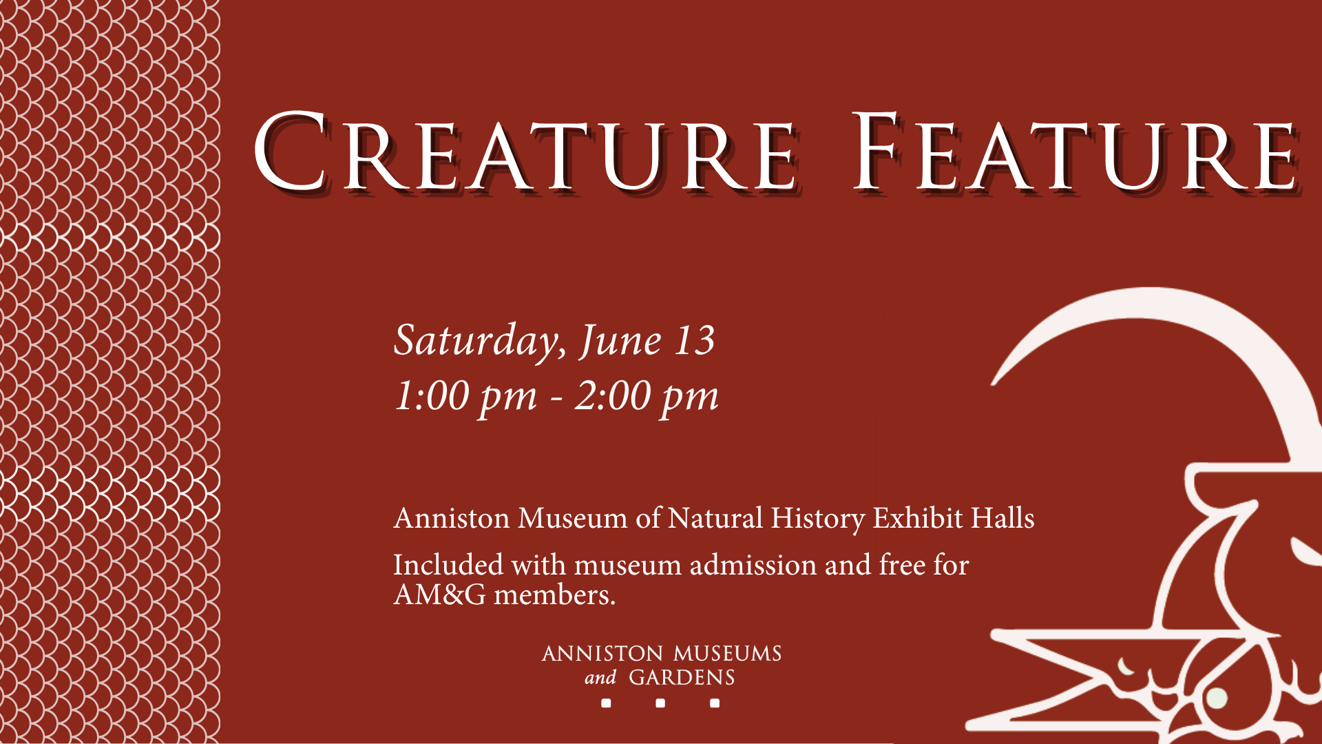 Did you know that Anniston Museums and Gardens is home to a variety of live reptiles, mammals, and birds? Make plans to join us in the exhibit halls on the 2nd Saturday of each month between 1:00 pm and 2:00 pm to meet and learn about one of our animal ambassadors. You never know who will be featured!