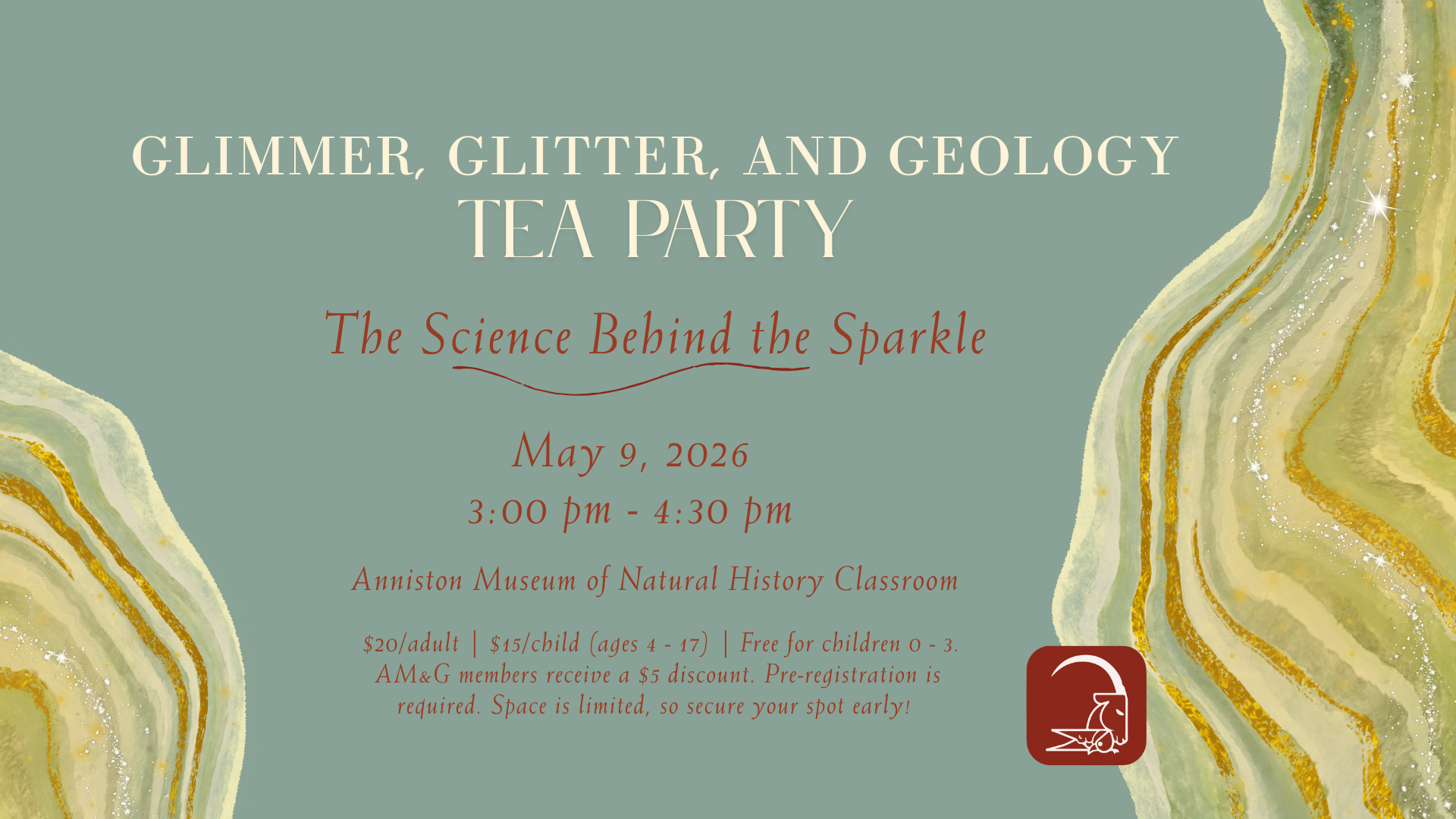 Glimmer, Glitter, and Geology Tea Party is $20/adult | $15/child (ages 4 – 17) |. Free for children 0 – 3. AM&G members receive a $5 discount. Pre-registration is required. Space is limited, so secure your spot early!