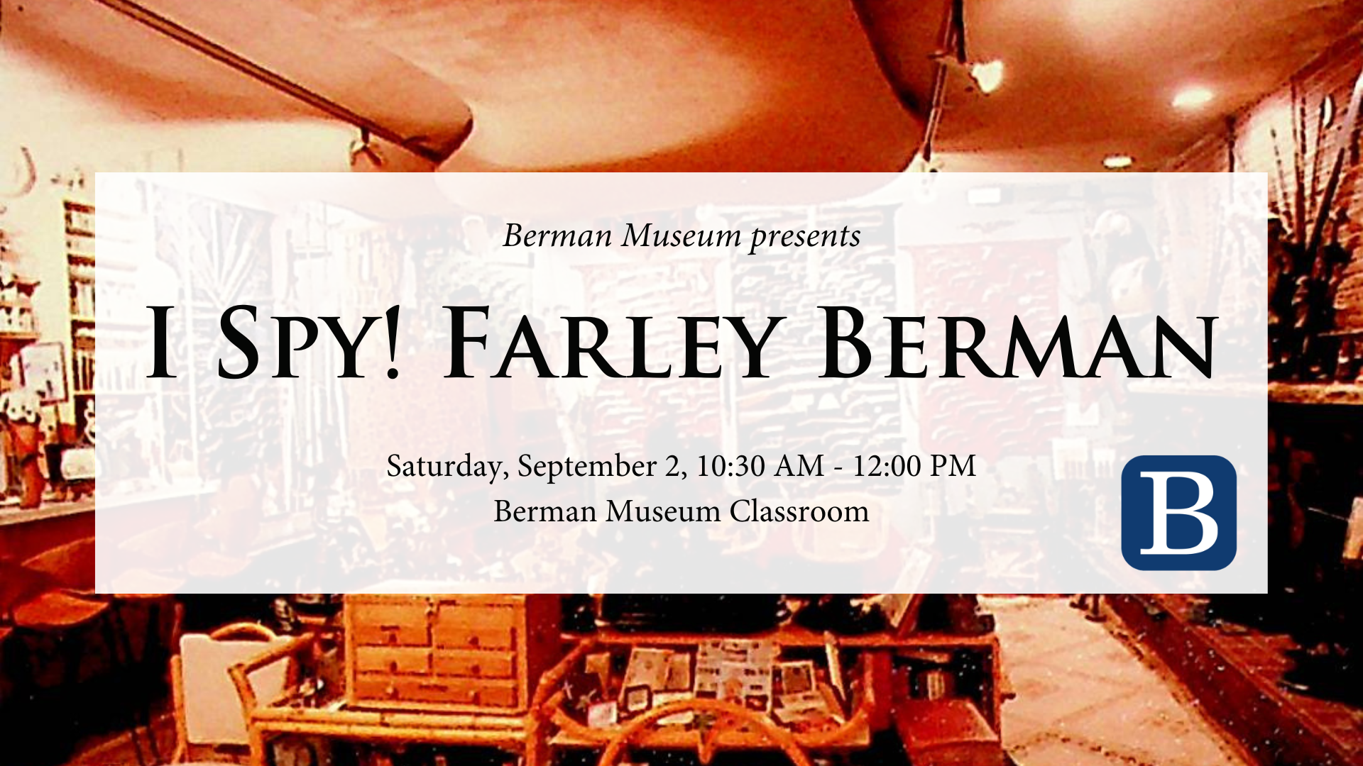 It’s time for I Spy! at the Berman Museum. We will explore a new topic or person in history through stories, scavenger hunts, and crafts. This month, we will learn about Farley Berman and what it means to be a spy. I Spy! is recommended for ages 6 – 10, but all are welcome. Pre-registration is encouraged.