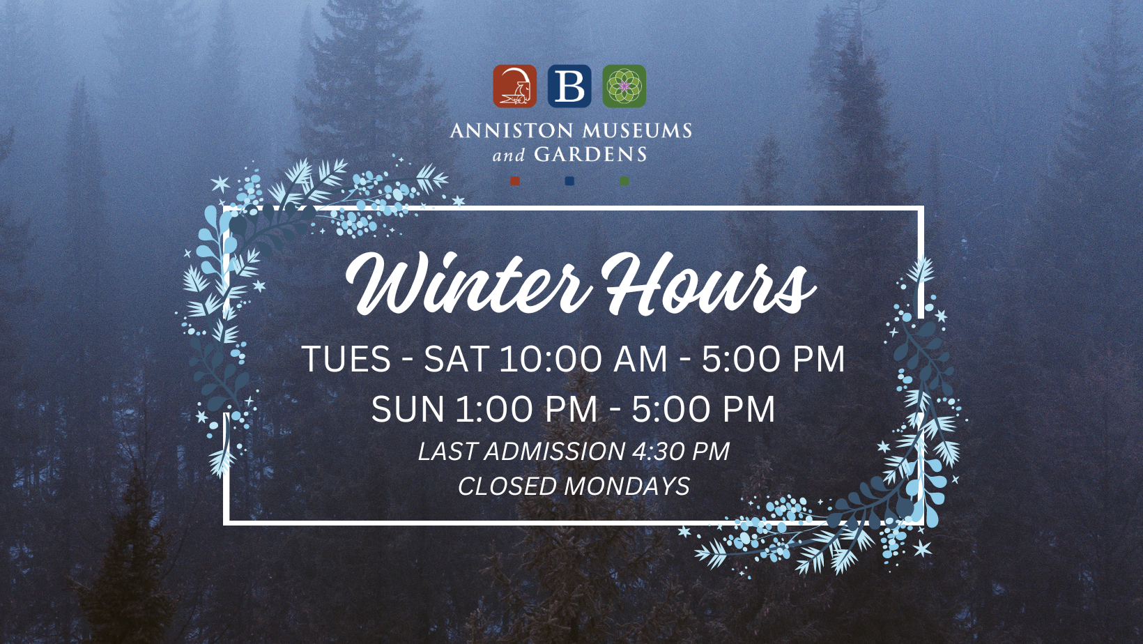 The Anniston Museums and Gardens is closed on Mondays from Labor Day – Memorial Day.