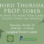 - 16Third Thursday: PROP-tober . . . Fun Ways to Make New Garden Plants Over the Winter10:00 am - 11:30 amDespite the end of the growing season and the often dry weather, autumn is still a good time to propagate some of your favorite plants. We will show you some unique, but easy methods to propagate indoors over the winter, and you’ll leave with examples of three different propagation methods. Begonias in a recycled salad , ...Plant Sale10:00 am - 5:00 pmThird Thursday is Plant Sale day! Support the growth of the Longleaf Botanical Gardens and your gardening green thumb by purchasing plants! We have a variety of trees, shrubs, natives, tropicals, and more! Plant Sales are at the LBG Greenhouses from 10:00am – 5:00pm. Directions: Drive up Museum Drive. Pass the Anniston , ...