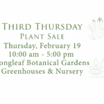 Third Thursday is Plant Sale day! Support the growth of the Longleaf Botanical Gardens and your gardening green thumb by purchasing plants! We have a variety of trees, shrubs, natives, tropicals, and more! Plant Sales are at the LBG Greenhouses from 10:00am – 5:00pm. Directions: Drive up Museum Drive. Pass the Anniston , ... - 20